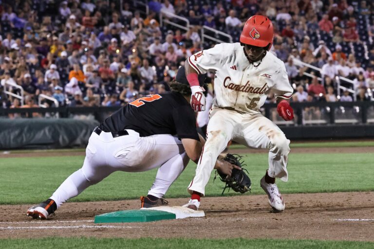 The Louisville Cardinals face the Oregon State Beavers in an elimination game of the 2025 Men’s College World Series on …