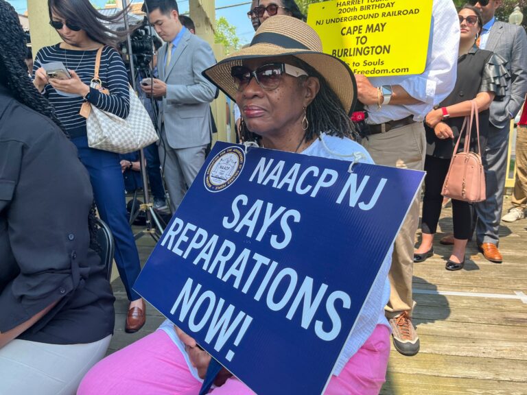 On Monday, June 19, 2023, Deborah Smith Gregory, president of the Newark NAACP, displays a sign at the Reparations Council …
